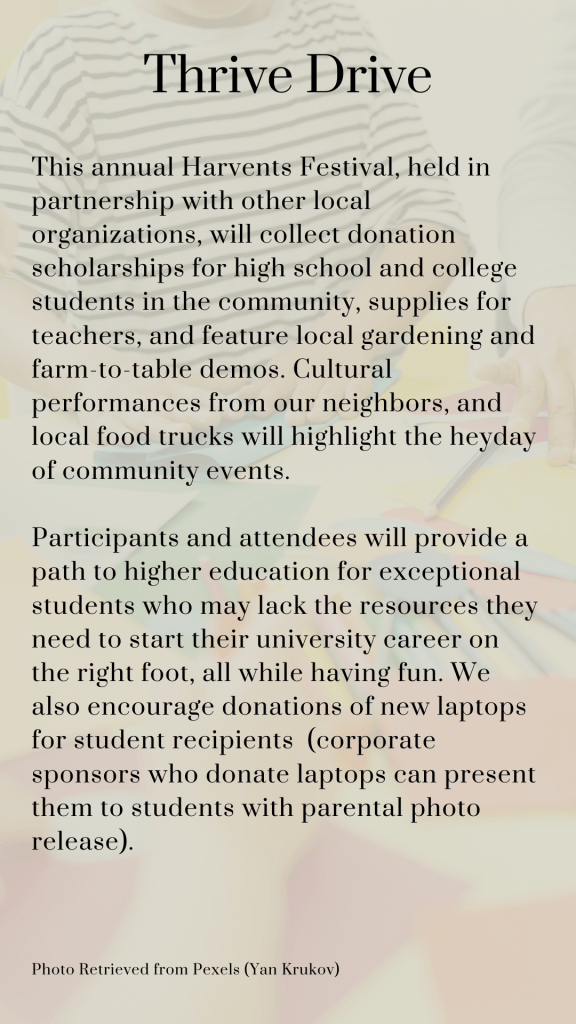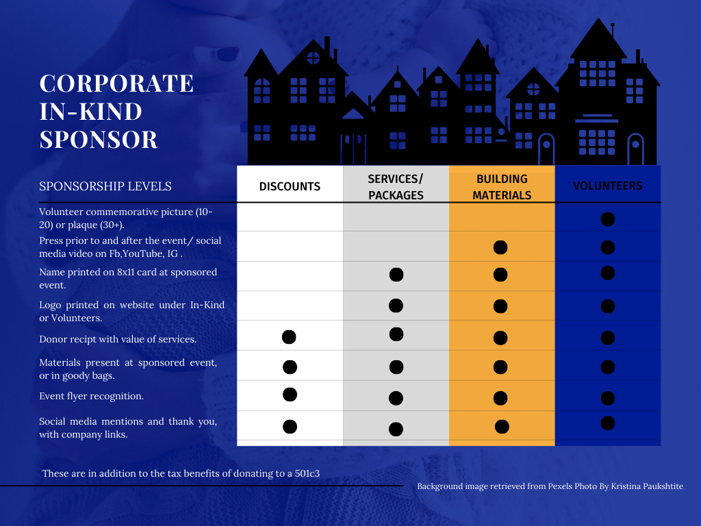 Annual sponsorship helps us renovate homes, put on events to benefit children in the community, mentor, and provide case management for employment to parents. Your annual sponsorship grantees your top placement on our website’s sponsorship page, with company name and logo, as well as reliable tax benefits.