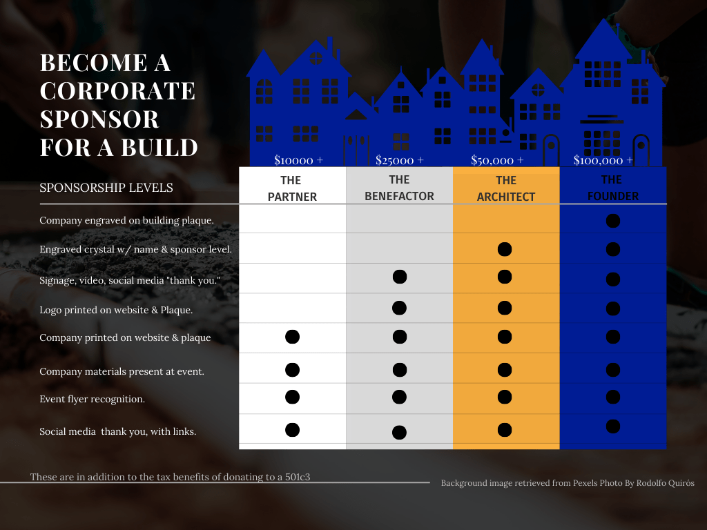 Sponsors can use the community build project sponsorship levels as a guide to thier annual support plans. Eliminating child homelessness in metro single-parent families is our major goal. Options are very flexible to fit a sponsor’s needs. Our h onored ponsors can reference the levels below to fit their business’s objectives and goals.