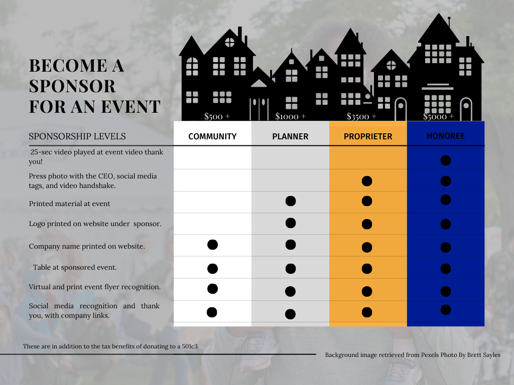 Annual Sponsors can use the event sponsorship levels as a guide or even choose a monthly or one-time amount to support eliminating child homelessness in metro single-parent families. Options are very flexible to fit a sponsor’s needs. Event sponsors can reference the levels below to fit their business’s objectives and goals.