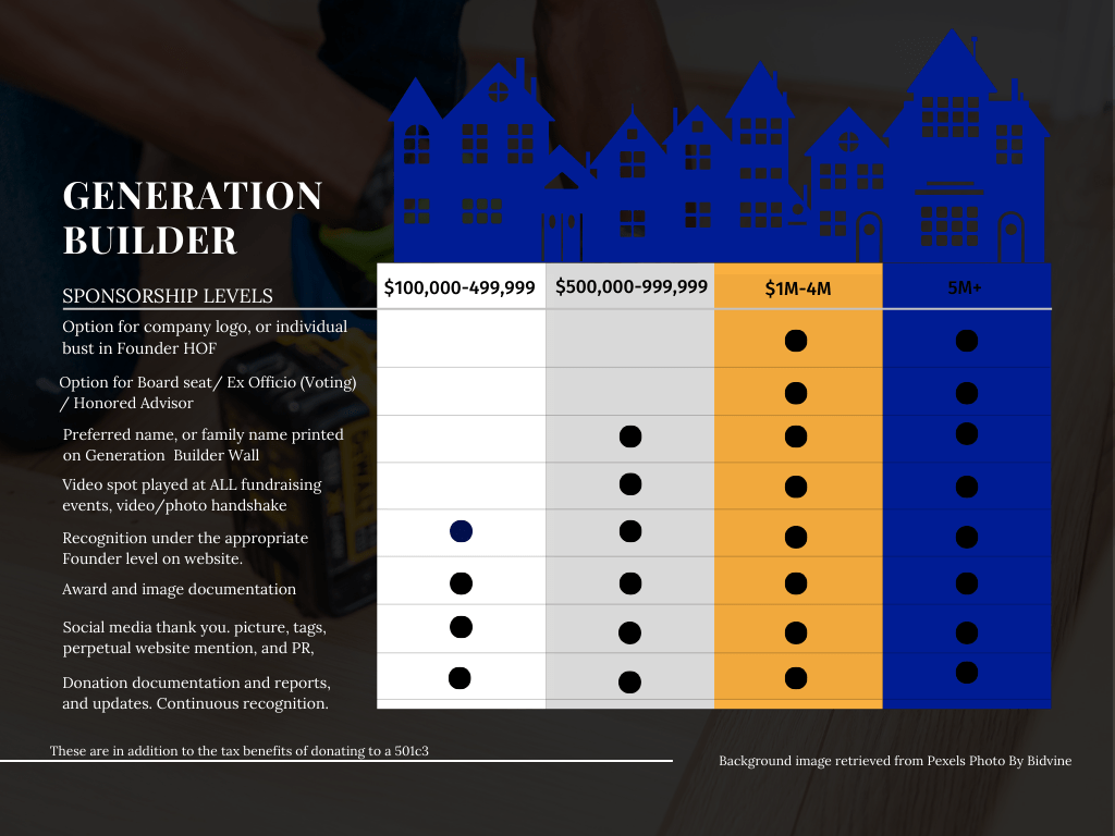 Our Generation Builder level is for large private, corprate, and other benefactors that move our mission forward, and change outcomes that tough generations of children.